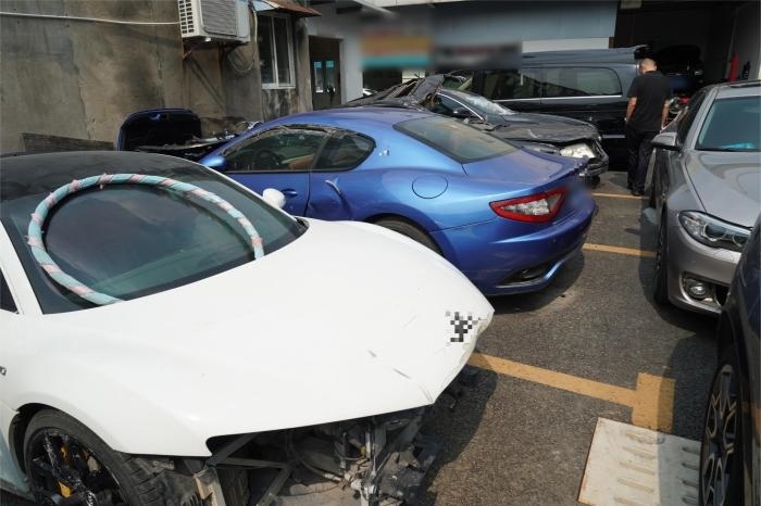 涉案維修廠(chǎng)內(nèi)存放的事故豪車(chē)(央廣網(wǎng)發(fā) 上海警方供圖)