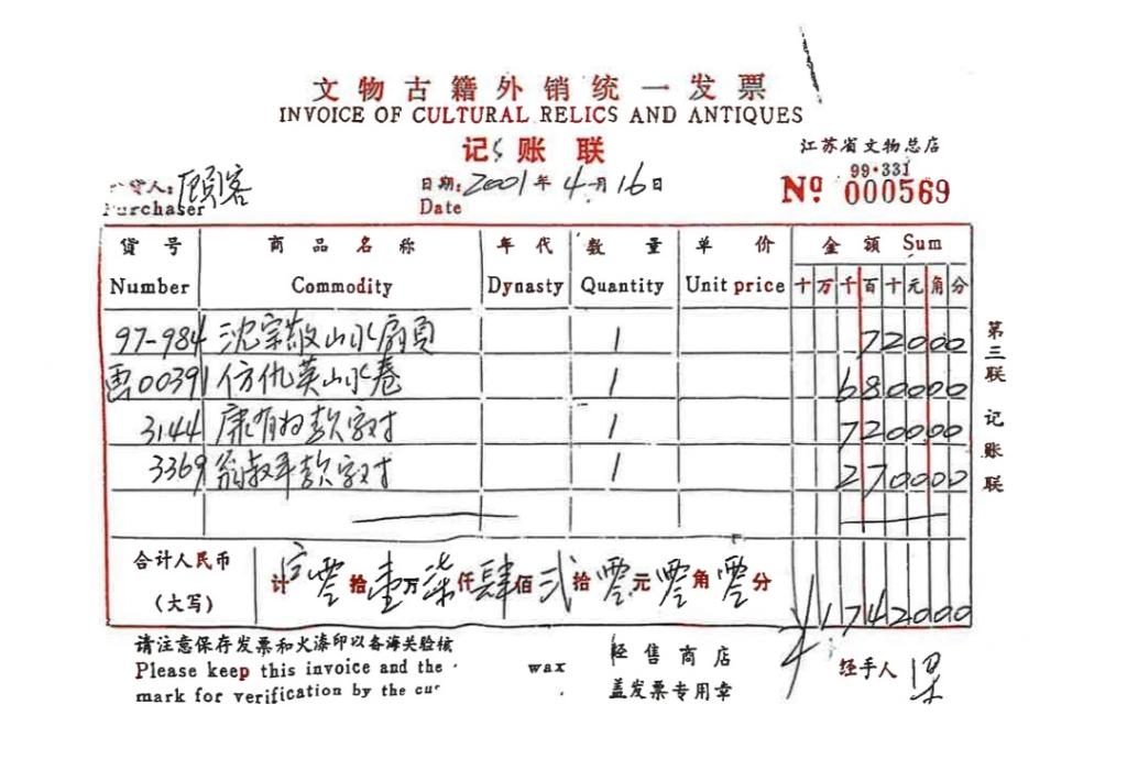 原江蘇省文物總店銷售發(fā)票顯示,《仿仇英山水卷》于2001年4月16日被“顧客”以6800元價(jià)格購買。(受訪者供圖)