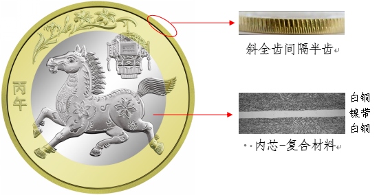 硬幣外環(huán)為黃銅合金,內(nèi)芯為具有獨(dú)特機(jī)讀性能的鎳帶復(fù)合白銅材料。防偽特征效果見(jiàn)圖1。