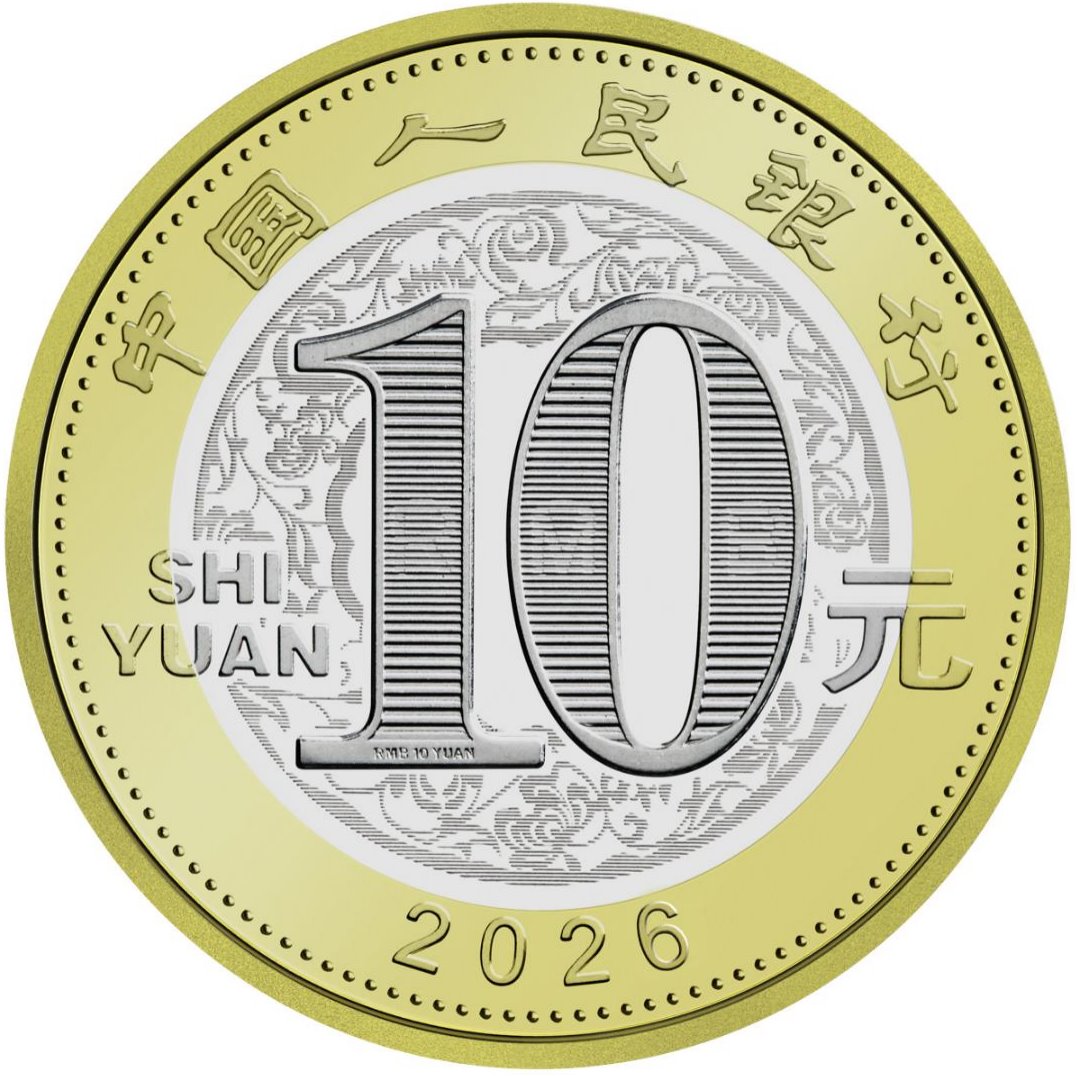 雙色銅合金紀(jì)念幣正面圖案為“中國(guó)人民銀行”、“10元”字樣,漢語(yǔ)拼音字母“SHIYUAN”及年號(hào)“2026”,底紋襯以團(tuán)花圖案。