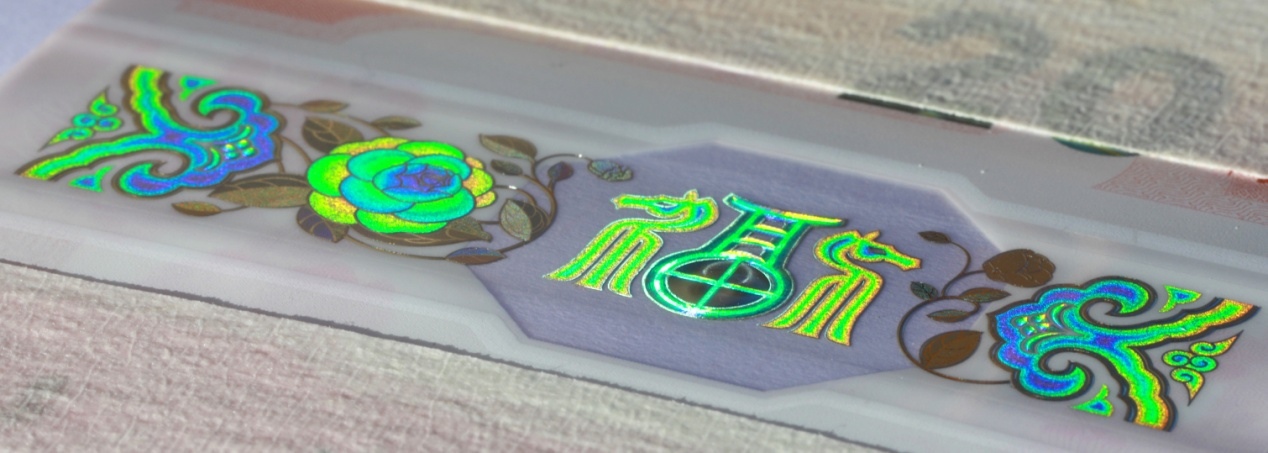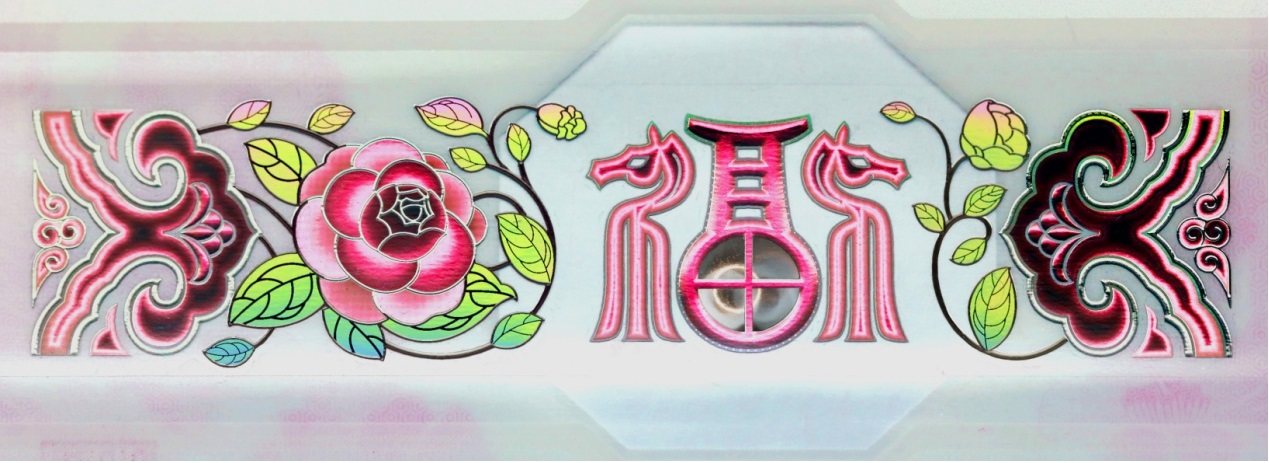 位于票面下方。改變觀察角度,票面正面可見(jiàn)“如意云紋”、“山茶花”與“?!弊纸M成的裝飾紋樣呈現(xiàn)多色動(dòng)感特征?!案!弊窒虏俊疤铩弊謨?nèi)可見(jiàn)立體動(dòng)感高亮圓環(huán)效果。防偽特征效果見(jiàn)圖6。