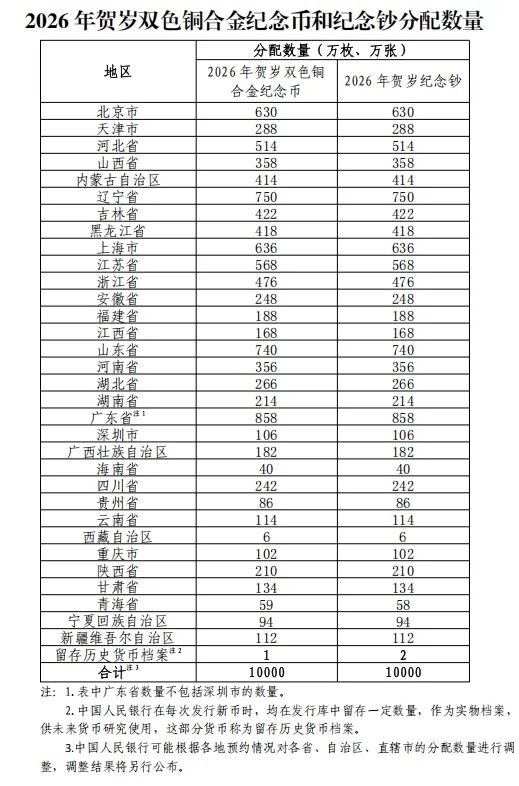 2026年1月12日前,中國(guó)人民銀行分支機(jī)構(gòu)將向社會(huì)公告當(dāng)?shù)?026年賀歲雙色銅合金紀(jì)念幣和紀(jì)念鈔的分配數(shù)量等信息。承辦銀行將在其官方網(wǎng)站公布2026年賀歲雙色銅合金紀(jì)念幣和紀(jì)念鈔預(yù)約兌換網(wǎng)點(diǎn)及每個(gè)網(wǎng)點(diǎn)的可預(yù)約數(shù)量等信息。