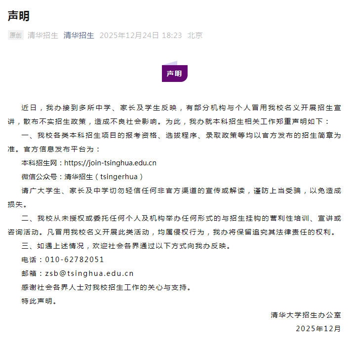 據(jù)“清華招生”微信公眾號(hào)消息,清華大學(xué)招生辦公室24日發(fā)布聲明稱,近日,清華大學(xué)招生辦公室接到多所中學(xué)、家長及學(xué)生反映,有部分機(jī)構(gòu)與個(gè)人冒用清華大學(xué)名義開展招生宣講,散布不實(shí)招生政策,造成不良社會(huì)影響。為此,清華大學(xué)招生辦公室就本科招生相關(guān)工作鄭重聲明如下: