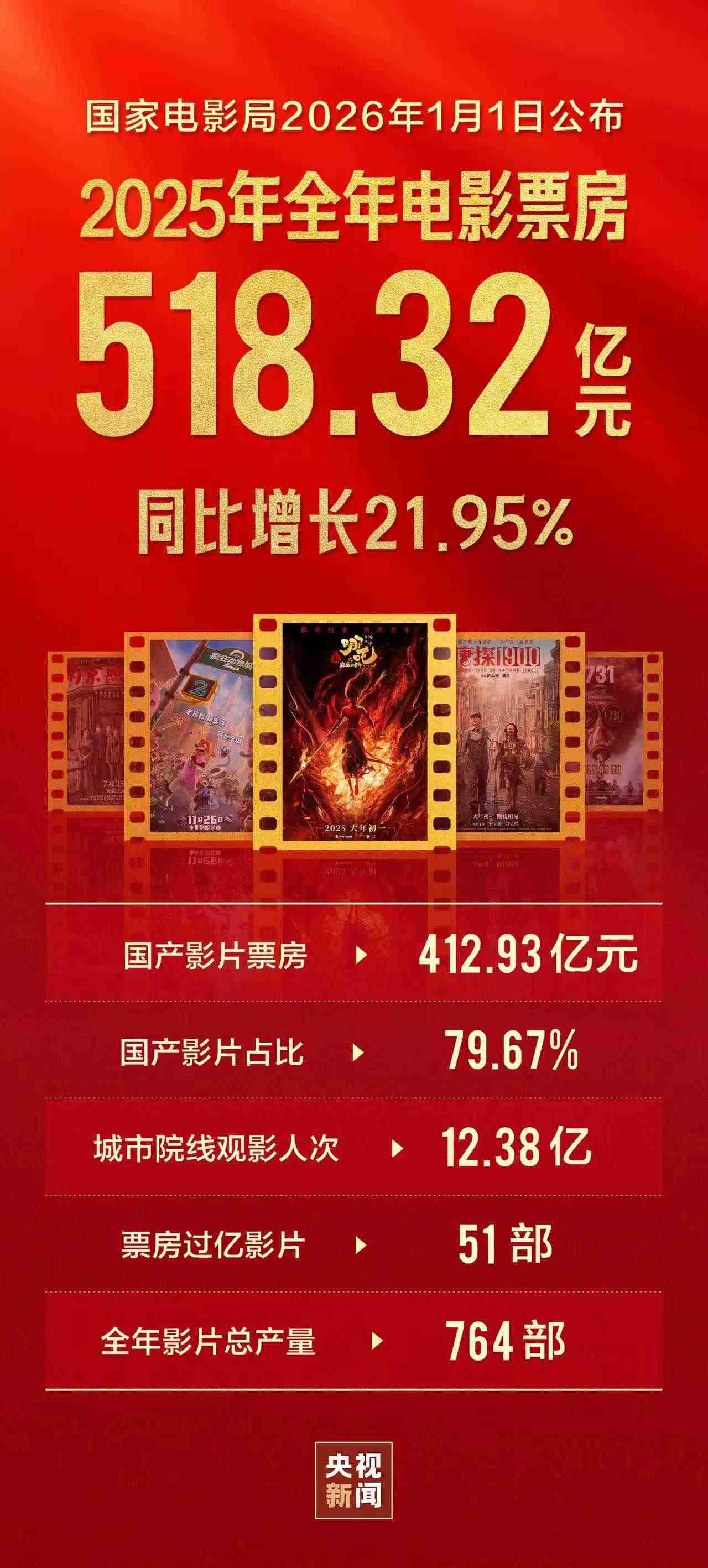 國家電影局2026年1月1日公布,2025年電影票房為518.32億元,同比增長21.95%,城市院線觀影人次為12.38億,同比增長為22.57%,國產(chǎn)影片票房為412.93億元,占比為79.67%。
