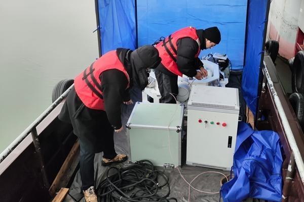 團隊成員冒著嚴寒在湖上調試設備。
