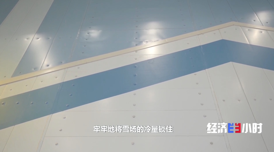 工作人員介紹,雪場(chǎng)四周和樓頂分布著1萬多塊冷庫板,牢牢將雪場(chǎng)冷量鎖住,隔絕內(nèi)外之間溫差。
