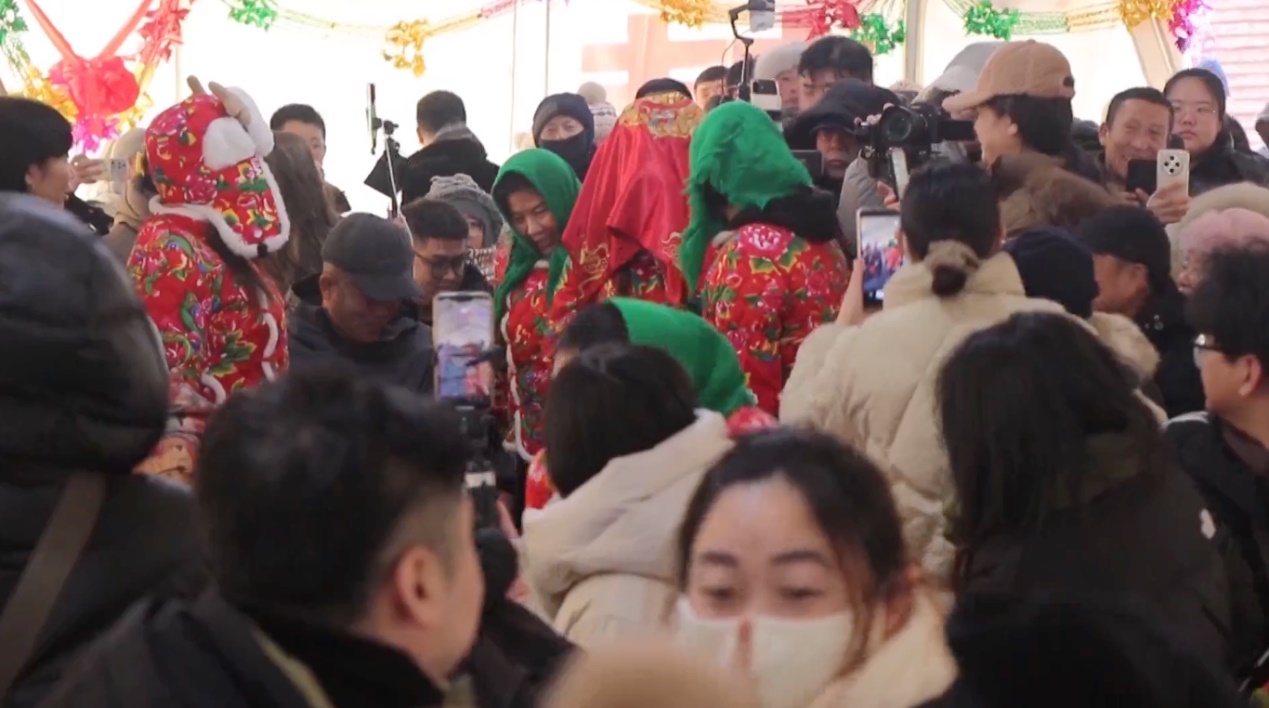 一場(chǎng)精心籌備的東北民俗婚禮體驗(yàn),讓大棚內(nèi)五湖四海的游客體驗(yàn)東北鄉(xiāng)土風(fēng)情,大棚外,鍋包肉、雪衣豆沙等小吃的裊裊熱氣氤氳升騰。