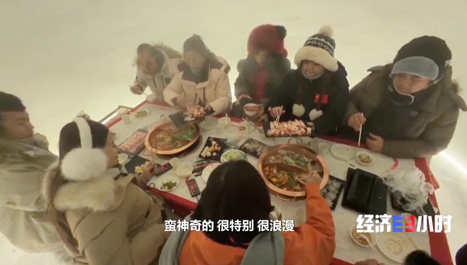 游客們?cè)诒煅┑乩锲弦怀?,一上岸,就奔向特色雪屋。在這里享用熱氣騰騰的火鍋,體驗(yàn)“冰火兩重天”的樂趣。
