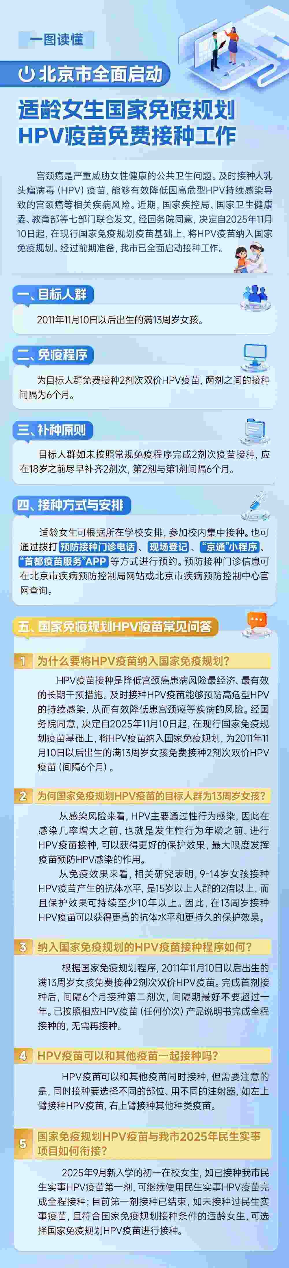 北京市疾控局1月9日介紹,北京已全面啟動(dòng)適齡女生國(guó)家免疫規(guī)劃HPV(人乳頭瘤病毒)疫苗免費(fèi)接種工作。