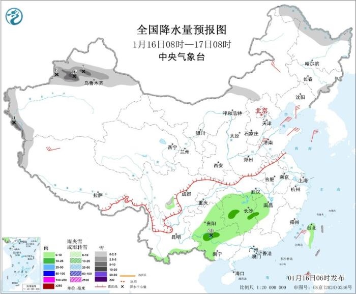 1月16日08時至17日08時,新疆沿天山地區(qū)及南疆西部山區(qū),黑龍江北部、吉林東部、西藏西部等地部分地區(qū)有小到中雪,其中,新疆沿天山西部地區(qū)和伊犁河谷等地部分地區(qū)有大到暴雪(10~16毫米);江南中西部、貴州東部和南部、廣西西部和北部、云南南部、臺灣島東部等地部分地區(qū)有小到中雨,廣西西北部局地有大雨(25~30毫米)。內蒙古中東部、華北北部、黃淮中東部、遼寧南部、西藏中西部等地部分地區(qū)有4~6級風;渤海、渤海海峽、黃海北部和中部有5~7級風、陣風8級(見圖1)。