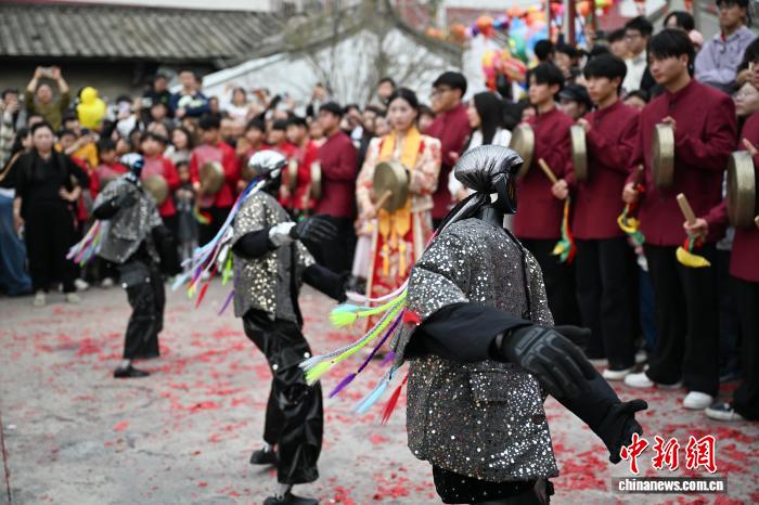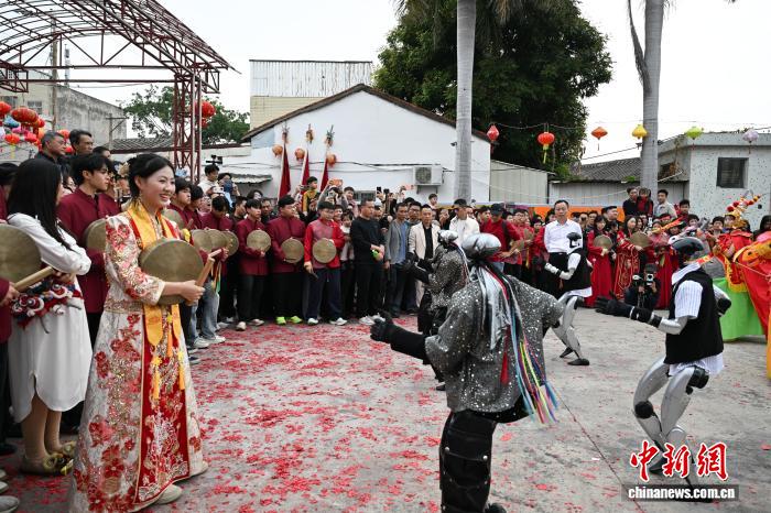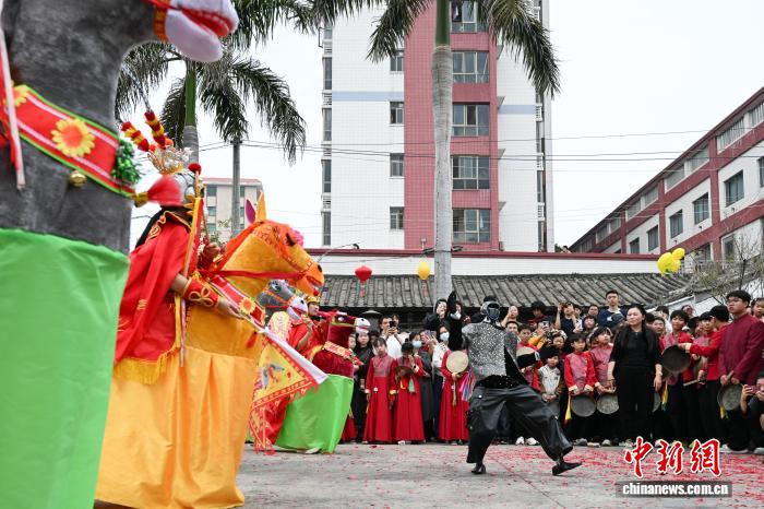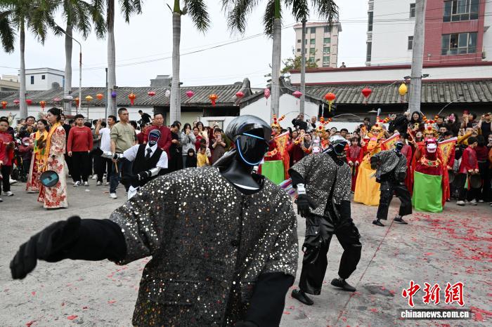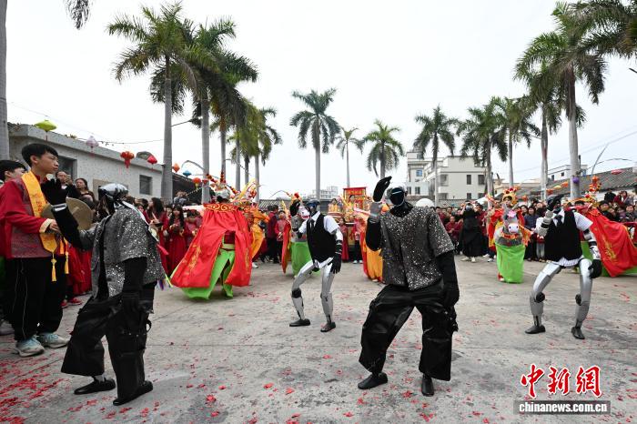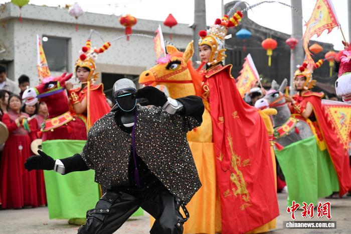 2月24日,廣東省潮州市田頭何村開展民俗巡游活動,機器人與布馬舞舞者共舞,吸引村民觀看。中新社記者 陳楚紅 攝