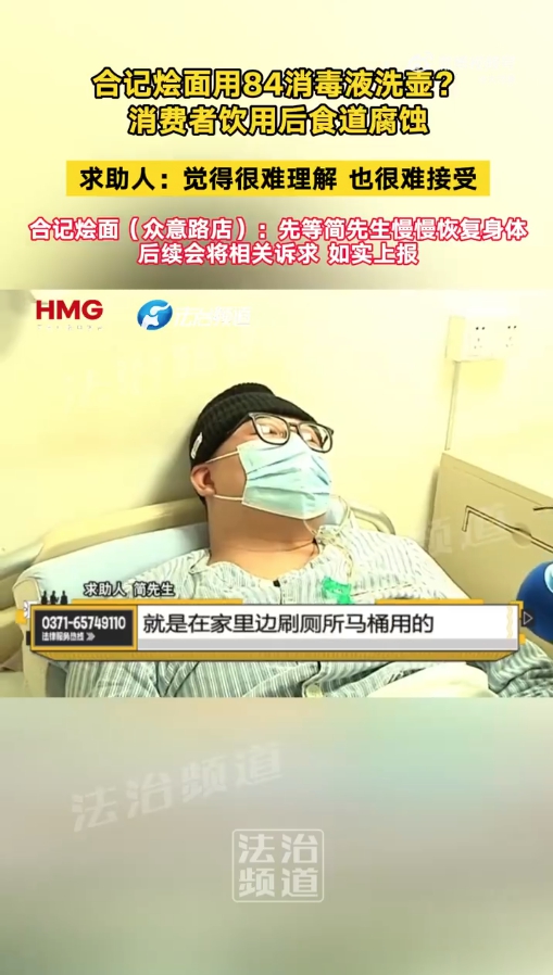 中新網(wǎng)北京3月16日電(記者 劉星晨)“現(xiàn)在胃和食道還覺得疼,吃東西以流食和半流食為主,吞咽饅頭這種會(huì)有困難?!痹诤?jiǎn)先生的講述里,由于在鄭州合記燴面眾意路店用餐期間喝到了含有84消毒液的水,他過去三個(gè)月一度瘦了30斤。