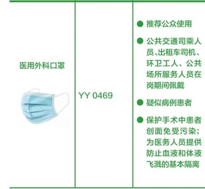 醫(yī)用外科口罩:防護(hù)效果優(yōu)于一次性使用醫(yī)用口罩,推薦公眾包括疑似病例患者、公共交通司乘人員、出租車(chē)司機(jī)、環(huán)衛(wèi)工人、公共場(chǎng)所服務(wù)人員在崗期間佩戴。該類(lèi)型口罩還可保護(hù)手術(shù)中患者創(chuàng)面免受污染,可為醫(yī)務(wù)人員提供防止血液和體液飛濺的基本隔離。(橫列為口罩的圖片+名稱(chēng)、產(chǎn)品標(biāo)準(zhǔn)、建議應(yīng)用場(chǎng)景。圖片來(lái)源:中國(guó)疾控中心)