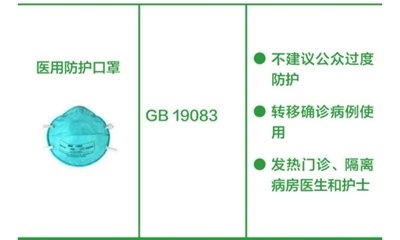 醫(yī)用防護(hù)口罩:推薦發(fā)熱門(mén)診、隔離病房醫(yī)護(hù)人員,以及確診新型冠狀病毒感染患者轉(zhuǎn)移使用。資源缺乏時(shí),不建議公眾過(guò)度防護(hù),可留給一線醫(yī)護(hù)人員使用。(橫列為口罩的圖片+名稱(chēng)、產(chǎn)品標(biāo)準(zhǔn)、建議應(yīng)用場(chǎng)景。圖片來(lái)源:中國(guó)疾控中心)