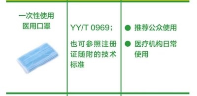 一次性使用醫(yī)用口罩:推薦公眾和醫(yī)療機(jī)構(gòu)的日常使用。(橫列為口罩的圖片+名稱(chēng)、產(chǎn)品標(biāo)準(zhǔn)、建議應(yīng)用場(chǎng)景。圖片來(lái)源:中國(guó)疾控中心)