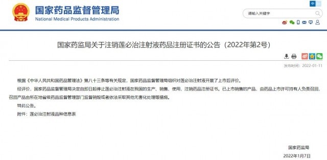國家藥監(jiān)局:自即日起停止蓮必治注射液在我國的生產(chǎn)、銷售、使用