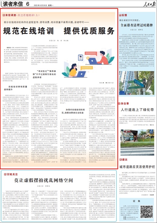 根據(jù)網(wǎng)友反饋的問題,6月26日,人民日?qǐng)?bào)讀者來信版“來信調(diào)查”欄目刊發(fā)在線培訓(xùn)調(diào)查報(bào)道《規(guī)范在線培訓(xùn) 提供優(yōu)質(zhì)服務(wù)》,文中多處引用了人民網(wǎng)“人民投訴”平臺(tái)用戶相關(guān)案例和線索。