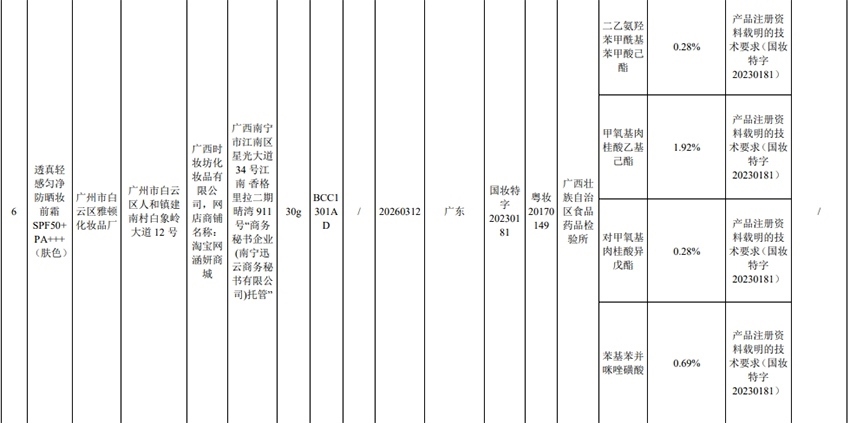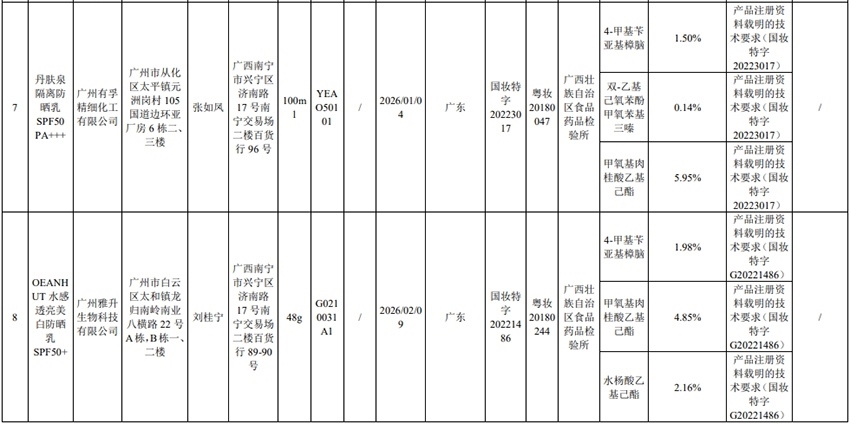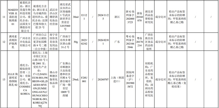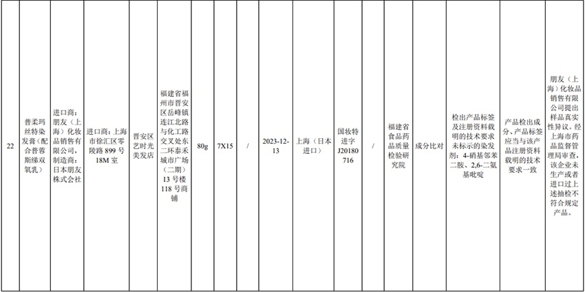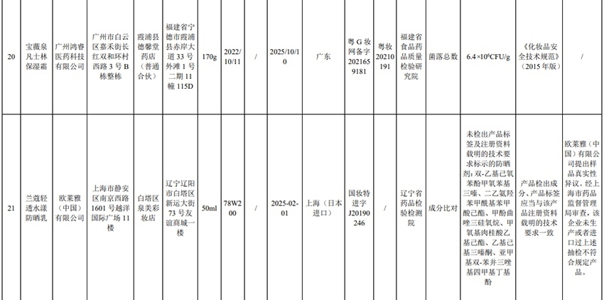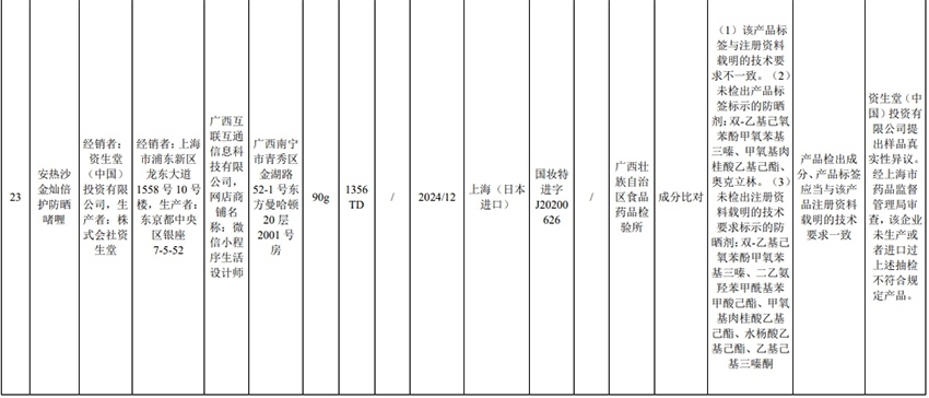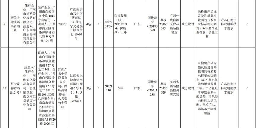 記者注意到,其中,產(chǎn)品標(biāo)簽標(biāo)示為歐萊雅(中國)有限公司生產(chǎn)的蘭蔻輕透水漾防曬乳(標(biāo)示批號(hào):78W200)“未檢出產(chǎn)品標(biāo)簽及注冊資料載明的技術(shù)要求標(biāo)示的防曬劑”;產(chǎn)品標(biāo)簽標(biāo)示為朋友(上海)化妝品銷售有限公司進(jìn)口的普柔瑪絲特染發(fā)膏(配合普蓉斯綈雙氧乳)(標(biāo)示批號(hào):7X15)“檢出產(chǎn)品標(biāo)簽及注冊資料載明的技術(shù)要求未標(biāo)示的染發(fā)劑”;產(chǎn)品標(biāo)簽標(biāo)示為資生堂(中國)投資有限公司經(jīng)銷的安熱沙金燦倍護(hù)防曬啫喱(標(biāo)示批號(hào):1356TD)“產(chǎn)品標(biāo)簽與注冊資料載明的技術(shù)要求不一致”、“未檢出產(chǎn)品標(biāo)簽標(biāo)示的防曬劑”、“未檢出注冊資料載明的技術(shù)要求標(biāo)示的防曬劑”。