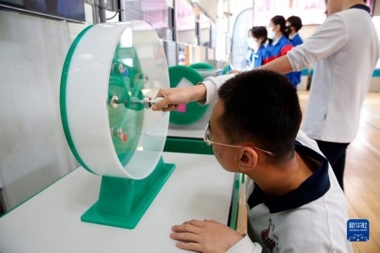 3月29日,中學(xué)生在校園流動科普巡展中體驗(yàn)趣味科學(xué)裝置。