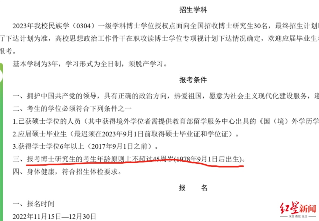 而根據(jù)《青海民族大學2023年民族學博士研究生招生簡章》,報考博士研究生的考生年齡原則上不超過45周歲(1978年9月1日后出生)。資料顯示,阿進錄為1973年出生。對于網友提到的“年齡不符合報考條件”,上述工作人員表示:“他資格審查是通過的?!?/strong>