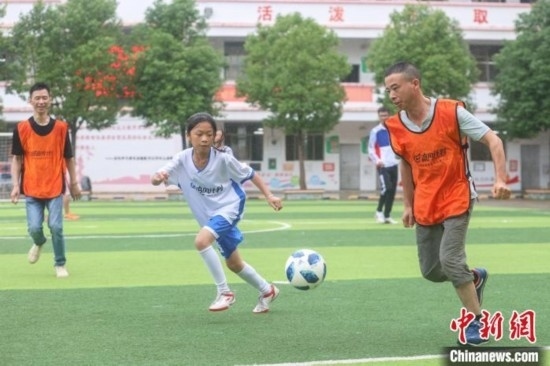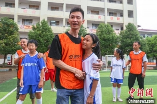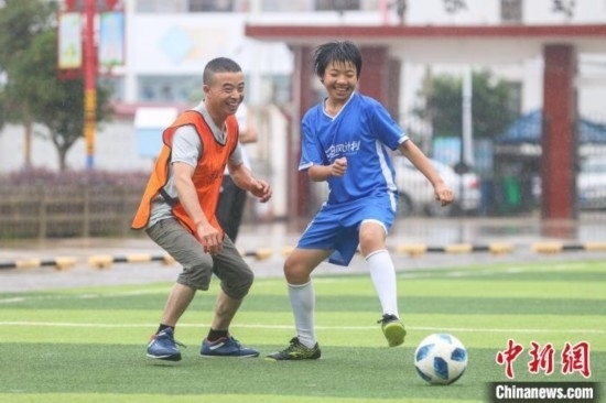 “今天第一次和爸爸踢球,我特別高興和感動。他踢得很好,還帶球過了我?guī)状?。我希望爸爸以后能多陪我踢球?!?4日,在江西贛州尋烏縣澄江中心校的足球場上,來自該校晨曦女子足球隊的隊員廖怡菱和其他四位隊員在父親節(jié)前夕,驚喜地見到了自己身在外地工作的父親,并第一次和父親一起踢球,進(jìn)行了一場特別的親子足球賽。