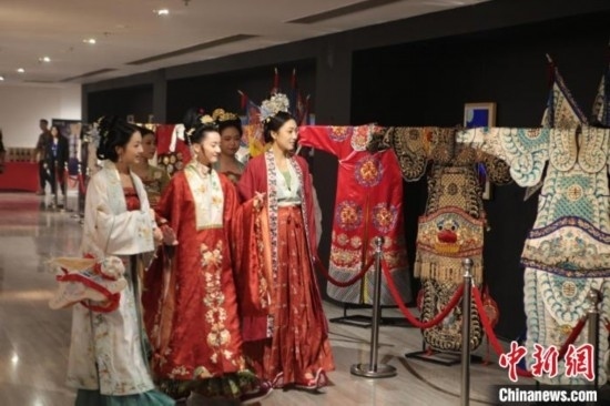 9月28日晚,第十四屆中華世紀(jì)壇中秋詩會在京舉行,圖為民眾身著漢服參觀京劇服裝。 主辦方供圖