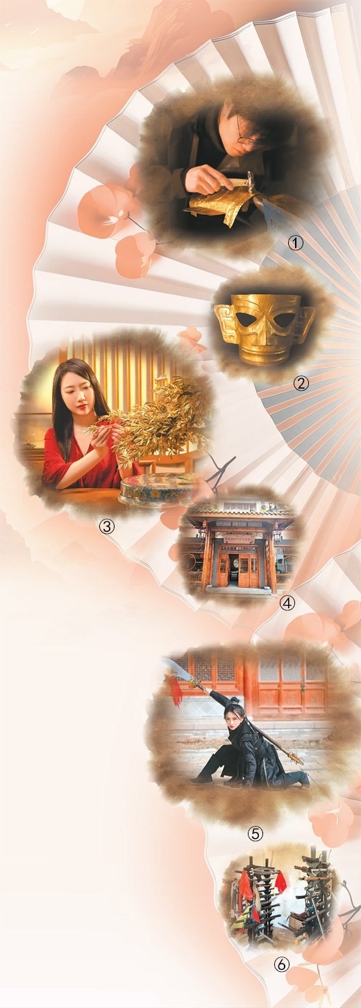 | 圖①:王莘閣在工作。圖②:王莘閣復(fù)刻的三星堆黃金面具。圖③:雁鴻展示她制作的工藝品。圖④:雁鴻國風(fēng)研習(xí)技藝館。圖⑤:張含亮在進行武術(shù)視頻拍攝。圖⑥:張含亮拍攝用的兵器道具。本文照片由受訪者提供潘旭濤制圖 |