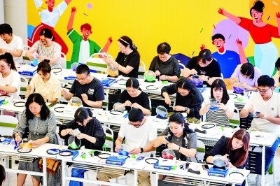 ——將顏料滴入水中,輕輕攪開,把扇子垂直浸入,入水時輕微旋轉(zhuǎn)使紋路多變,之后將扇子垂直拎出、晾干……非遺漆扇課堂上,傳統(tǒng)手藝吸引了眾多學員參與。