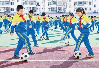 新學期伊始,河北省秦皇島市海港區(qū)耀華小學以足球素質操等活動結合十余種自主游戲項目,讓學生在趣味活動中提升體能。圖為2月18日,學生在展示足球素質操。