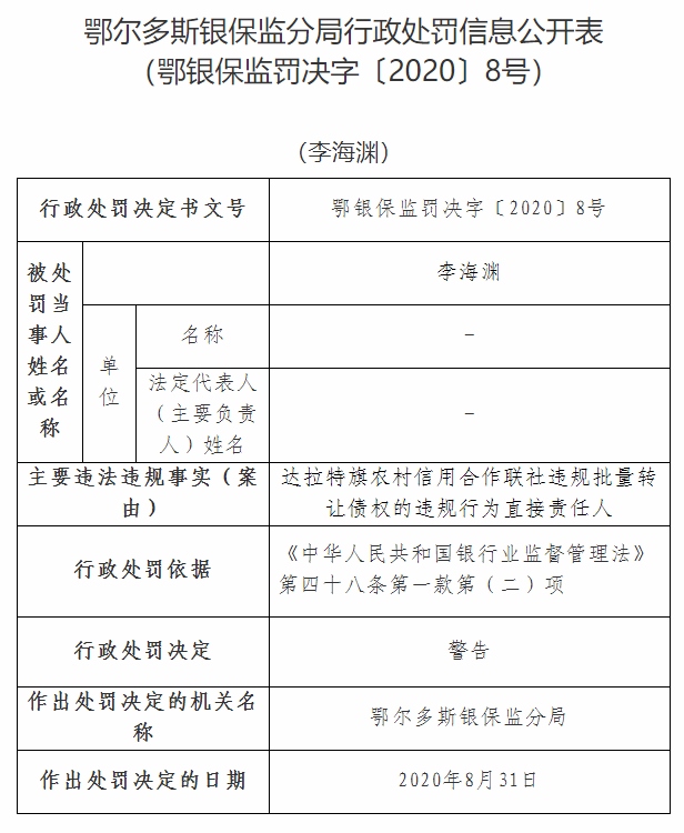 北疆新聞網(wǎng)、北疆新聞客戶端消息(記者 張楊)11月5日,銀保監(jiān)會(huì)官網(wǎng)通報(bào)達(dá)拉特旗農(nóng)村信用合作聯(lián)社違規(guī)批量轉(zhuǎn)讓債權(quán),被鄂爾多斯銀保監(jiān)分局依據(jù)《中華人民共和國(guó)銀行業(yè)監(jiān)督管理法》第四十六條第(五)項(xiàng),處以罰款25萬元。其法定代表人李海淵作為達(dá)拉特旗農(nóng)村信用合作聯(lián)社違規(guī)批量轉(zhuǎn)讓債權(quán)的違規(guī)行為直接責(zé)任人,被鄂爾多斯銀保監(jiān)分局依據(jù)《中華人民共和國(guó)銀行業(yè)監(jiān)督管理法》第四十八條第一款第(二)項(xiàng),處以警告處罰。