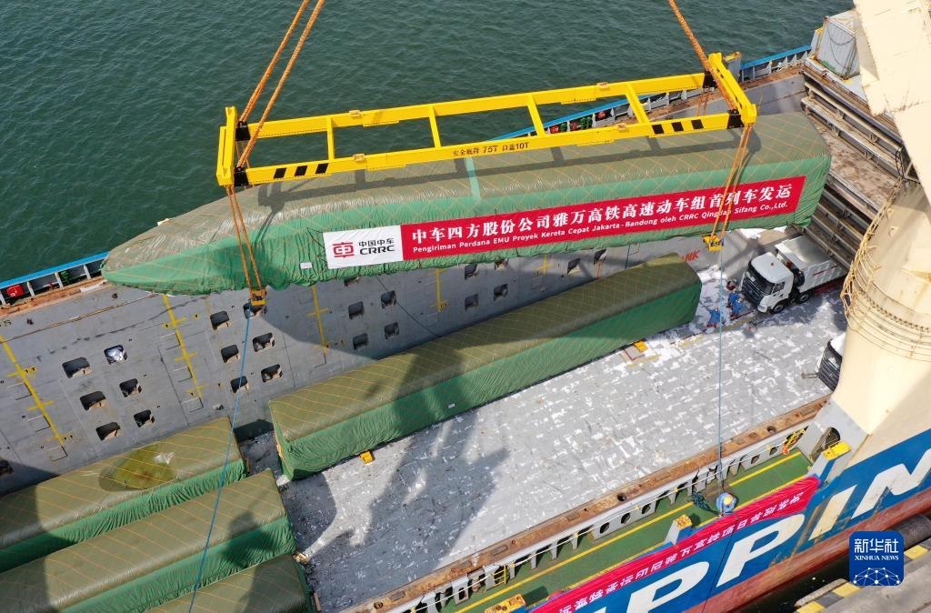 8月21日,我國出口印尼用于雅萬高鐵的1組高速動(dòng)車組和1組綜合檢測列車在山東港口青島港完成裝船,通過海運(yùn)發(fā)往印尼。
