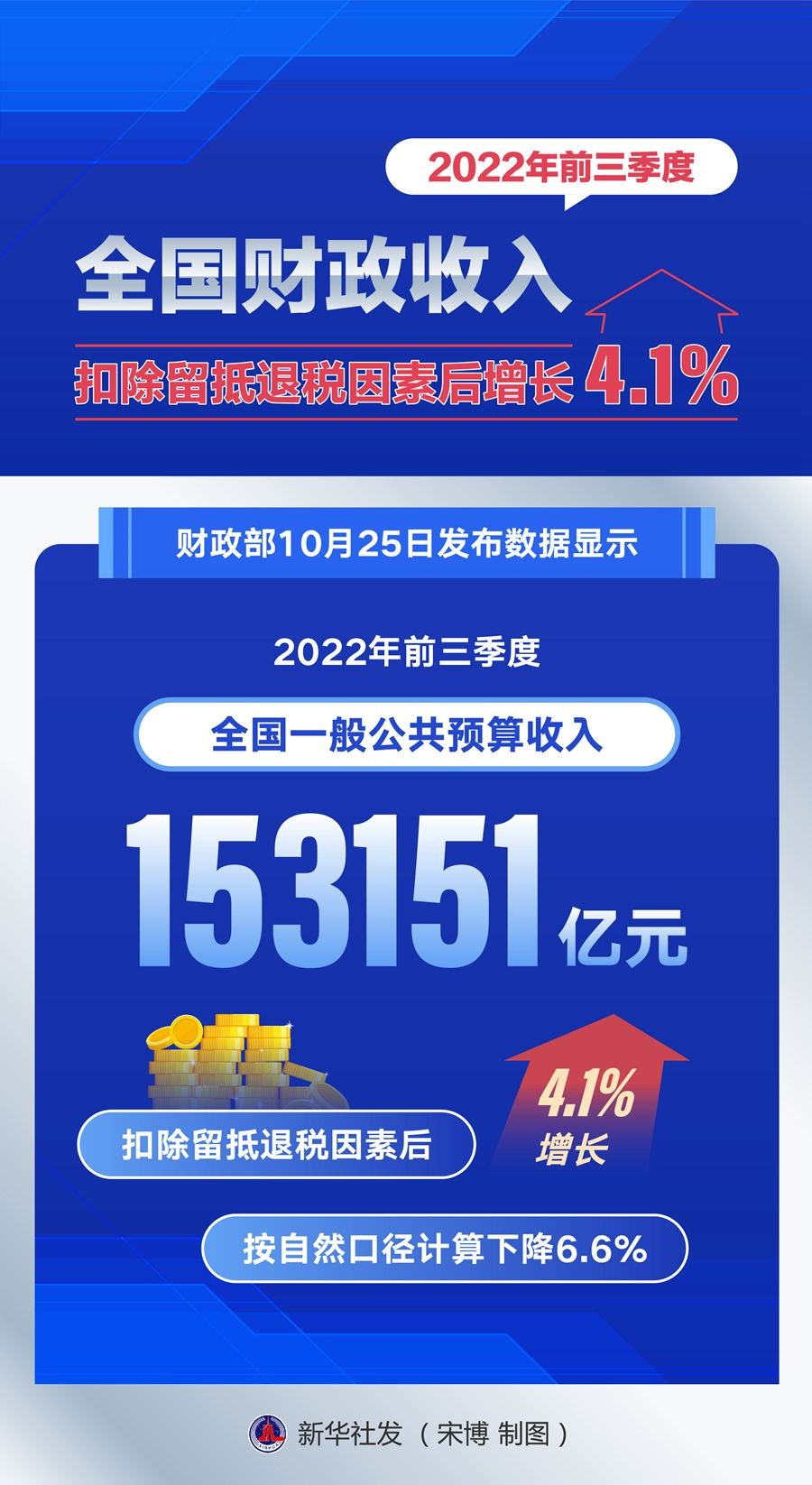 財(cái)政部25日發(fā)布數(shù)據(jù)顯示,今年前三季度,全國一般公共預(yù)算收入153151億元,扣除留抵退稅因素后增長4.1%,按自然口徑計(jì)算下降6.6%。