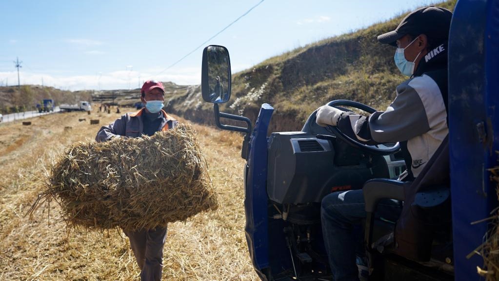 10月19日,日秀瑪村村民將剛打捆好的飼草裝車。新華社記者 陳杰 攝