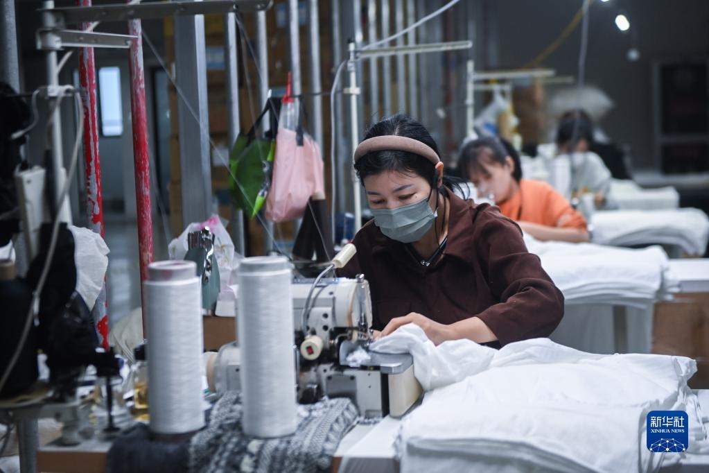 10月27日,在浙江省諸暨市大唐街道的一家專業(yè)生產拉絨打底褲產品的企業(yè)車間內,工作人員在加工拉絨打底褲。新華社記者 徐昱 攝