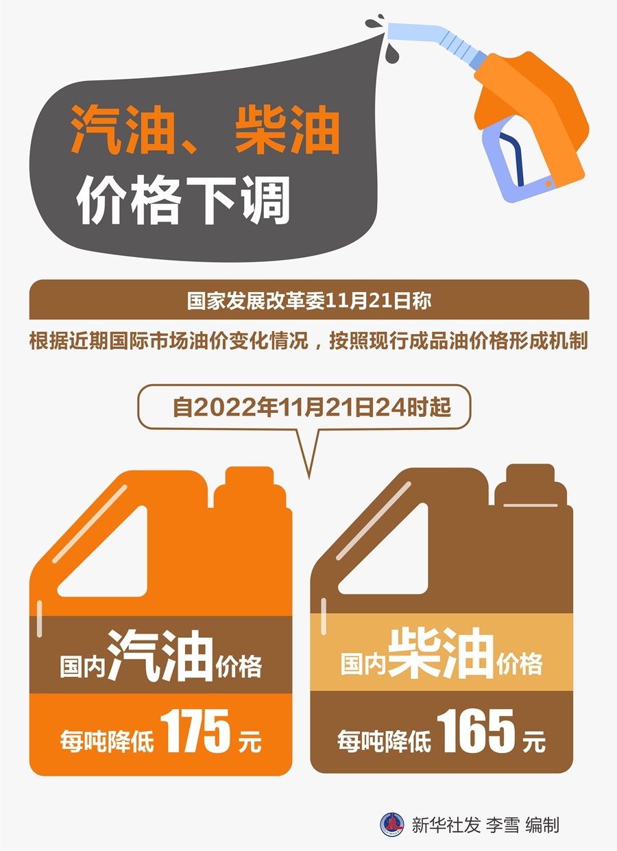 國家發(fā)展改革委21日稱,根據(jù)近期國際市場油價(jià)變化情況,按照現(xiàn)行成品油價(jià)格形成機(jī)制,自2022年11月21日24時(shí)起,國內(nèi)汽油、柴油價(jià)格每噸分別降低175元和165元。