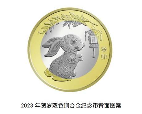 金銀紀念幣正面圖案均為中華人民共和國國徽,并刊國名、年號“2023”;背面圖案均為“?!弊?、舞獅造型等組合設(shè)計,并刊面額。雙色銅合金紀念幣正面圖案為“中國人民銀行”、“10元”字樣,漢語拼音字母“SHIYUAN”及年號“2023”,底紋襯以團花圖案;背面主景圖案為中國傳統(tǒng)剪紙藝術(shù)與裝飾年畫元素相結(jié)合的兔子形象,襯景圖案為花燈和桂枝、桂花,幣面左側(cè)刊“癸卯”字樣。