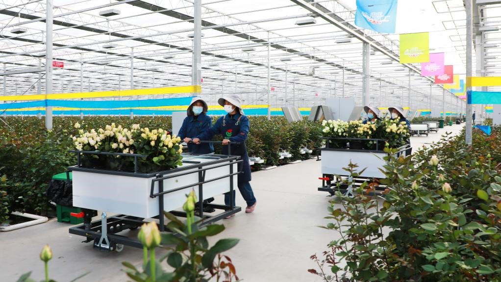 在位于甘肅省臨夏市的百益億農國際鮮花港,工人們正在搬運剛剛采摘的玫瑰。(受訪單位供圖)