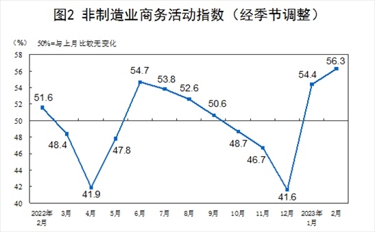 2月份,非制造業(yè)商務(wù)活動(dòng)指數(shù)為56.3%,比上月上升1.9個(gè)百分點(diǎn),連續(xù)兩個(gè)月位于景氣區(qū)間,非制造業(yè)恢復(fù)發(fā)展態(tài)勢(shì)向好。