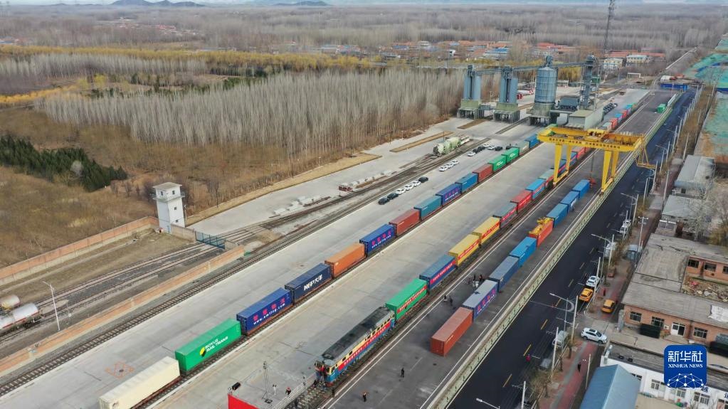 3月16日,在平谷地方鐵路馬坊站,京平綜合物流樞紐中歐班列(北京-莫斯科)停靠在站臺。新華社記者 任超 攝