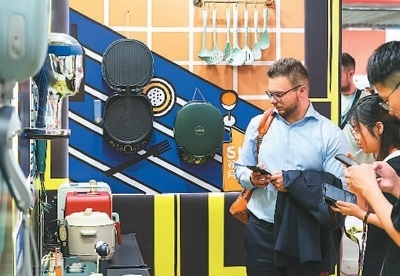 第133屆廣交會,主辦方專門在客流量最大的展館主通道區(qū)域設(shè)置了一批中國工業(yè)設(shè)計(jì)展位。圖為境外采購商正在了解一家中國工業(yè)設(shè)計(jì)企業(yè)的廚房電器產(chǎn)品。新華社記者 劉大偉攝