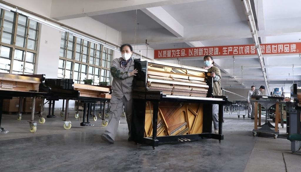 2月21日,工人在東北鋼琴樂(lè)器有限公司車間內(nèi)推運(yùn)鋼琴組件,趕制外貿(mào)訂單。新華社記者 姚劍鋒 攝