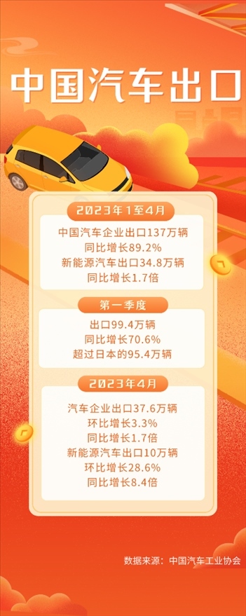 中國汽車工業(yè)協(xié)會的統(tǒng)計(jì)數(shù)據(jù)顯示,今年第一季度,國內(nèi)汽車企業(yè)出口99.4萬輛,同比增長70.6%,超過日本的95.4萬輛。最新數(shù)據(jù)顯示,4月份,出口37.6萬輛,同比增長1.7倍,其中,電動(dòng)、混動(dòng)等新能源汽車出口10萬輛,環(huán)比增長28.6%,同比增長8.4倍,保持良好勢頭。