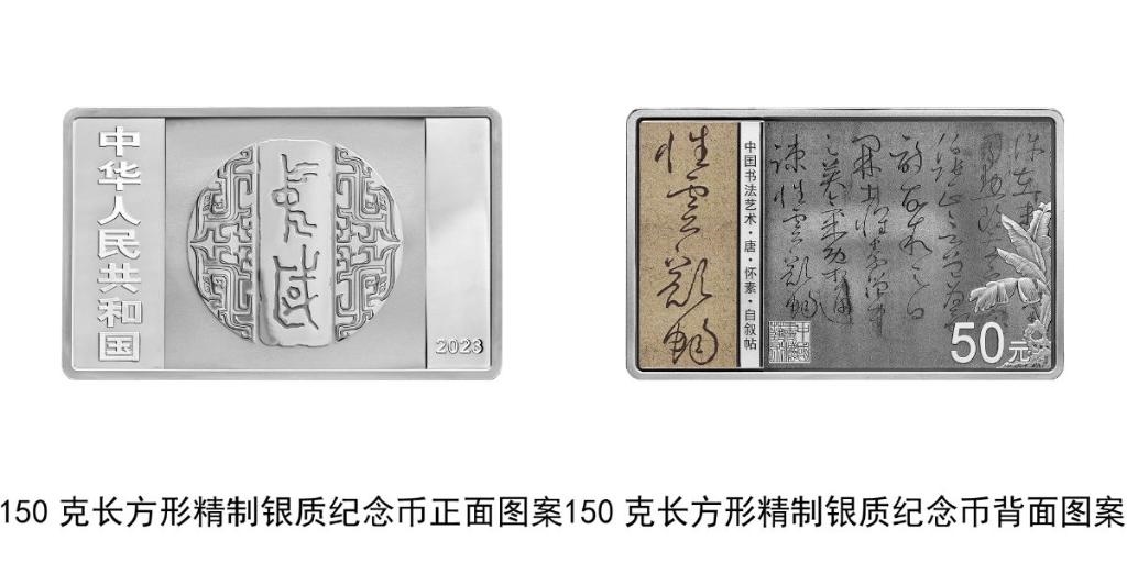 150克長(zhǎng)方形銀質(zhì)紀(jì)念幣背面圖案為唐代懷素書(shū)《自敘帖》局部文字及“性靈豁暢”字樣與芭蕉、石頭、“中國(guó)書(shū)法藝術(shù)”篆刻鈐印等組合設(shè)計(jì),并刊“中國(guó)書(shū)法藝術(shù)·唐·懷素·自敘帖”字樣及面額。