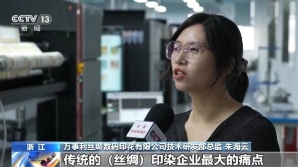 萬事利絲綢數(shù)碼印花有限公司技術(shù)研發(fā)部總監(jiān) 朱海云:傳統(tǒng)的絲綢印染企業(yè)最大的痛點就是庫存壓力,現(xiàn)在我們通過人工智能AI的設(shè)計,再加上我們的一體機(jī)快返的工藝特點,它能夠達(dá)到一個先銷后產(chǎn)的經(jīng)營模式,能夠解決我們庫存壓力的痛點。