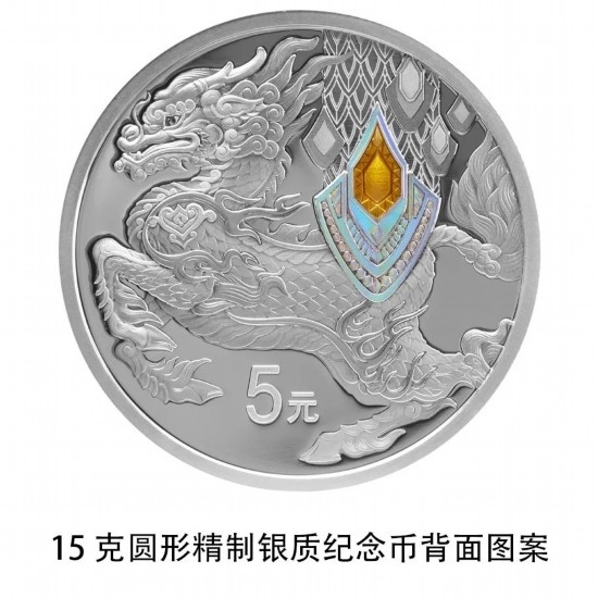 15克圓形銀質(zhì)紀(jì)念幣背面圖案為龍?jiān)煨?,并刊面額。
