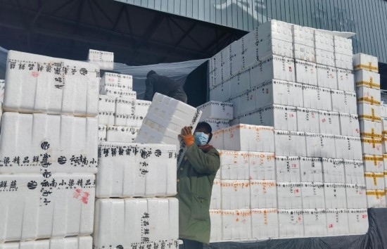“車(chē)來(lái)嘍!”“往里倒,再倒,好,裝車(chē)!”盡管天氣寒冷,市場(chǎng)里卻是一片火熱的繁忙景象。從各地運(yùn)來(lái)的蔬菜陸續(xù)進(jìn)場(chǎng),工作人員手腳麻利地將成箱的蔬菜從大車(chē)上卸下再裝上小車(chē),隨后,這些蔬菜將運(yùn)往寧夏各地小型批發(fā)市場(chǎng)和商超?!盀榱耸卟嗽谶\(yùn)輸過(guò)程中不被凍壞,我們給蔬菜蓋了3層棉被,確實(shí)下了一番功夫?!鄙虘?hù)馬伏珍說(shuō)。