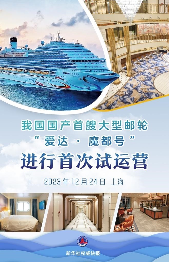 新華社上海12月24日電(記者賈遠琨、張辛欣)12月24日,國產首艘大型郵輪“愛達·魔都號”在上海吳淞口國際郵輪港離港出海,進行首次試運營。