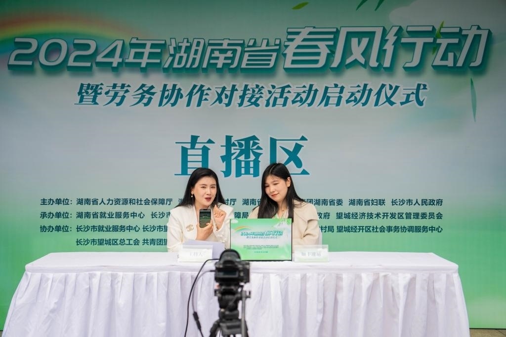 2月19日,在湖南省長沙市望城區(qū)市民廣場,工作人員在“春風(fēng)行動”招聘活動上通過網(wǎng)絡(luò)直播推薦工作崗位。新華社記者 陳思汗 攝