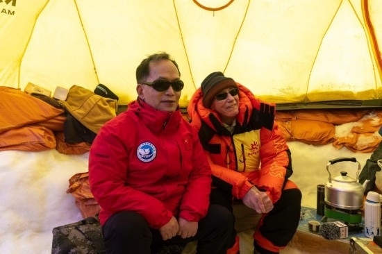 姚檀棟(左)、湯普森在普若崗日冰原10號冰川冰穹C作業(yè)點(diǎn)工作帳篷內(nèi)查看作業(yè)情況時(shí)合影。新華社記者姜帆 攝