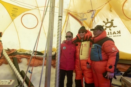 姚檀棟、湯普森在海拔5400米的普若崗日冰原科考主營地與部分科考隊(duì)員合影。新華社記者劉詩平 攝